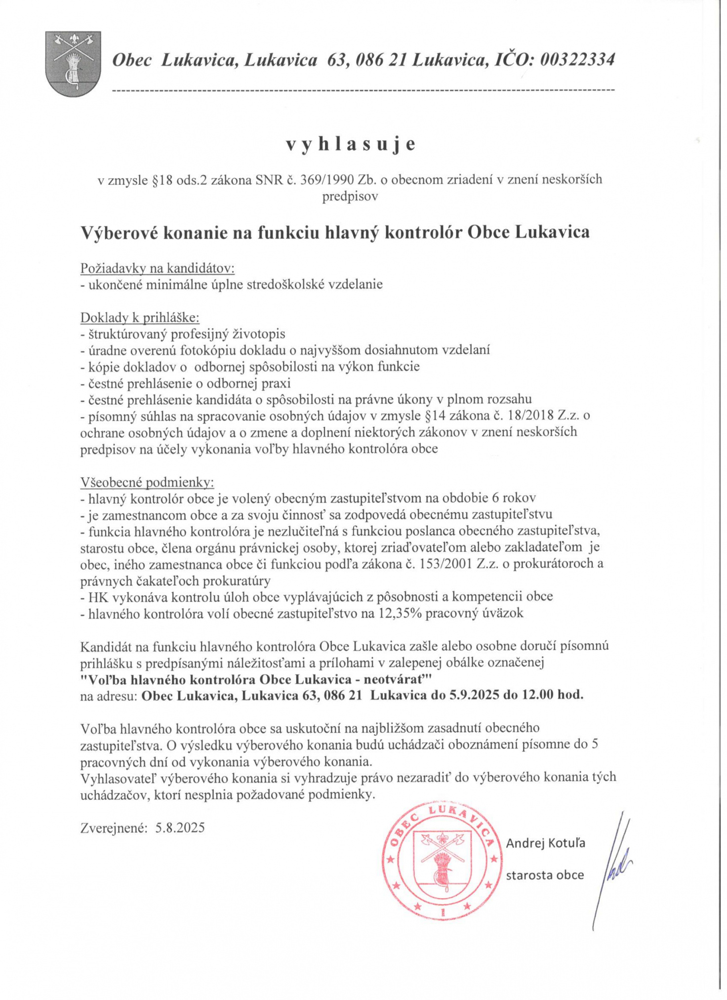 Výberové konanie na Hlavného kontrolóra Obce Lukavica